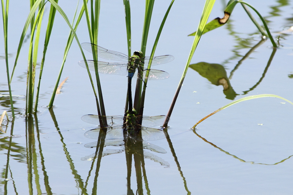 ギンヤンマ ギンヤンマ(産卵)→8月16日(日)水谷田んぼ。メスの尾が水中に深く潜っているのがわかると思いますが、草の茎に産卵管を刺して産卵しています。写真は山崎さん[毛利]